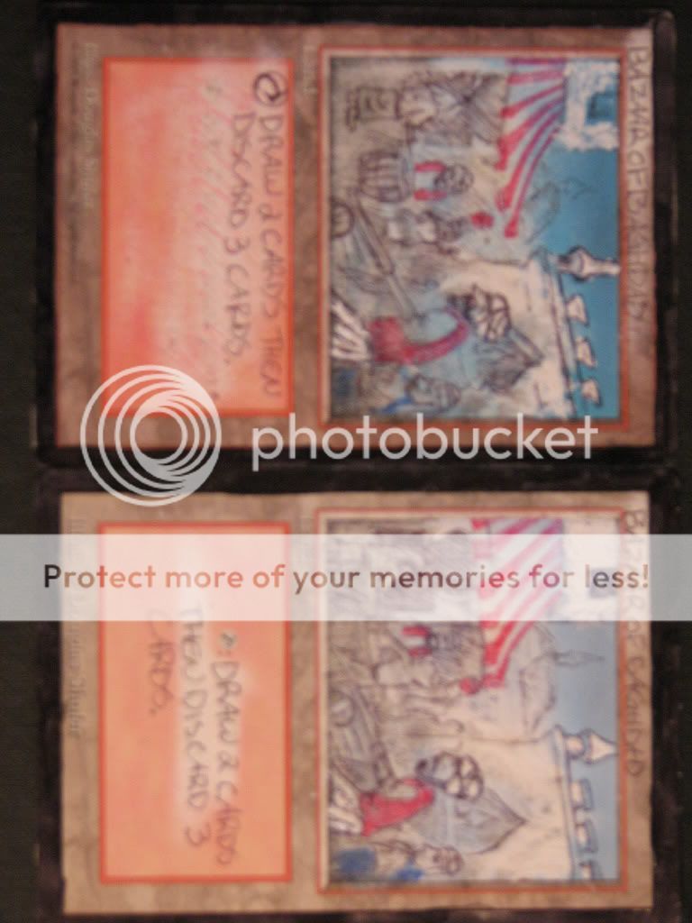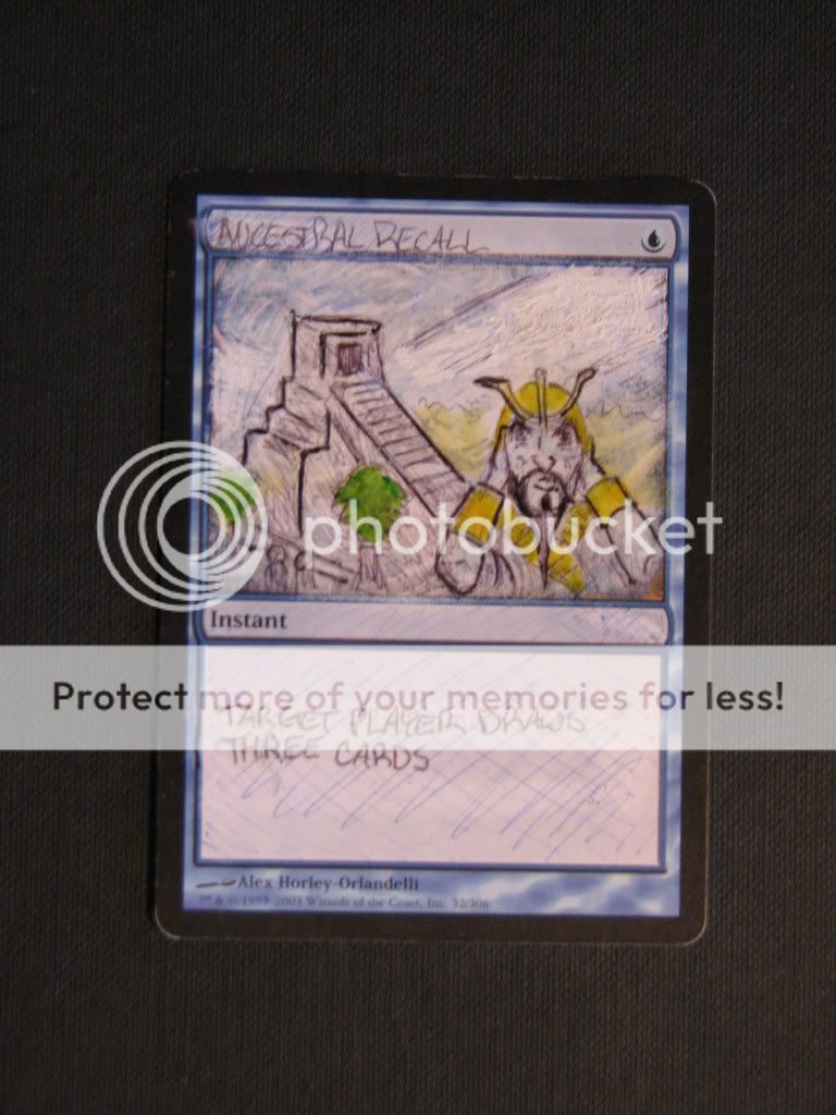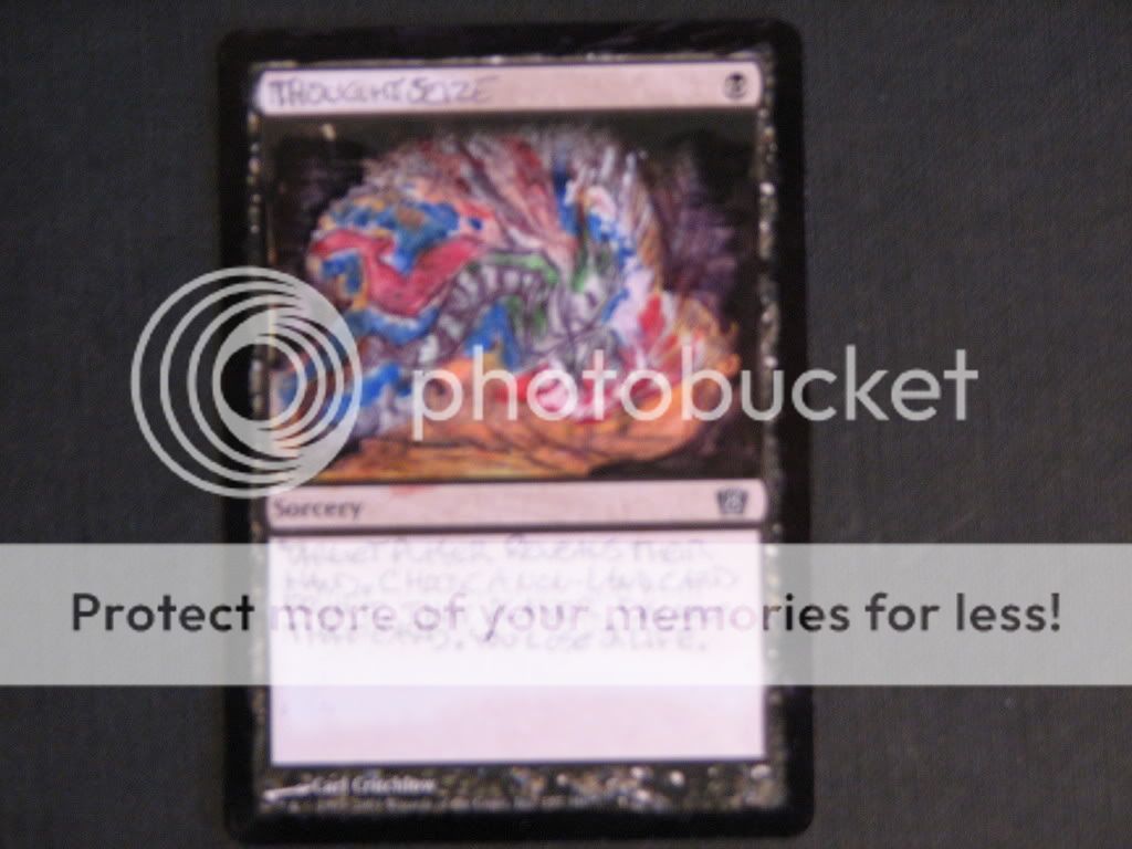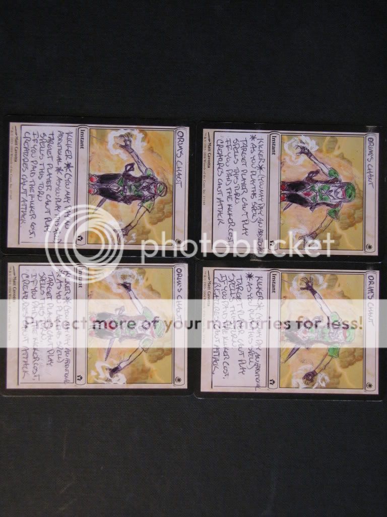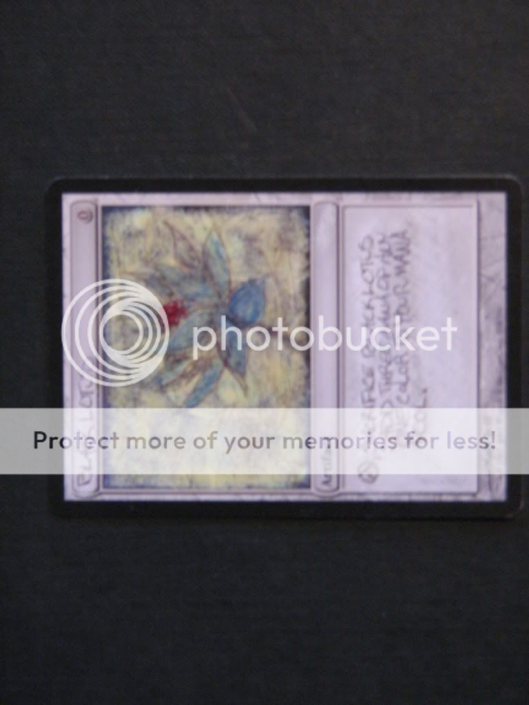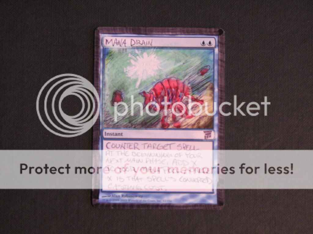 When choosing what card to use as the base for an erased proxy players must follow these rules: The mana cost of the base spell must be the same as the card being proxied. The type of the card being proxied must be the same as the base card. The P/T of a creature being proxied must be the same as the base creature P/T When proxying a creature it may be difficult to find a creature where all characteristics match. In this case, mana cost is the most important, followed by the P/T, followed by the subtype. Any characteristics that do not match must be erased and corrected. The art box, card name, and text box must be totally erased. White out may not be used for this as it affects the stiffness of the card and may mark it. When adding text to the card do not use a ball point pen. A extra fine point sharpie is the best thing to use. A ball point pen can cause indentations on the card marking it. For clarity reasons, the use of cards with the new card frame is strongly encouraged