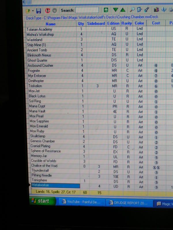 Game 2- My hand gave me 2 Needles, Bob, Grunt, and some lands. I am like, okay, this is good; 2x Needles and Bob will get me there. I led off with Needle on Wasteland, and then he played turn 1 Metalworker. So I played turn 2 Needle to shut off his Metalworker. But next turn he went broken was he dropped something and Chalice on two. Okay, I am dead, so dead, unless my draws will serve me good. Then, for the next 5 draws I drew 4 lands and a Jotun Grunt. Handshake, pack up, and leave.