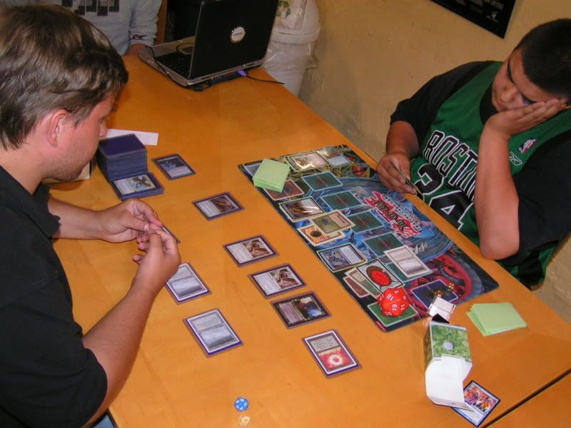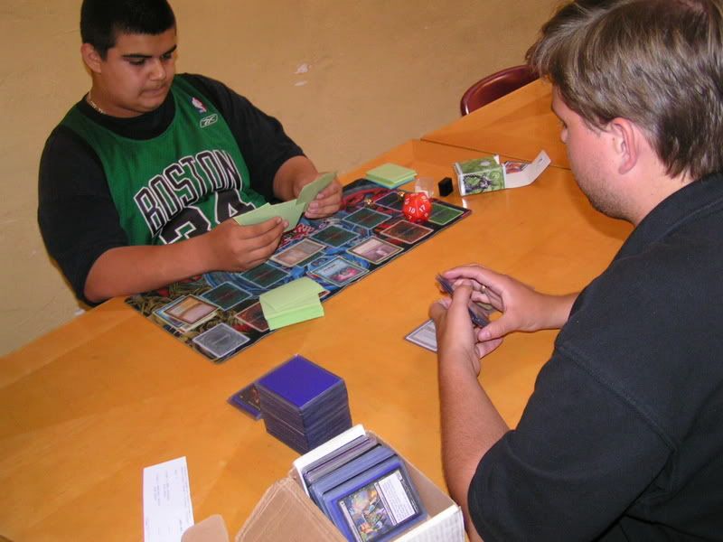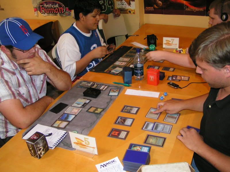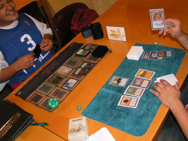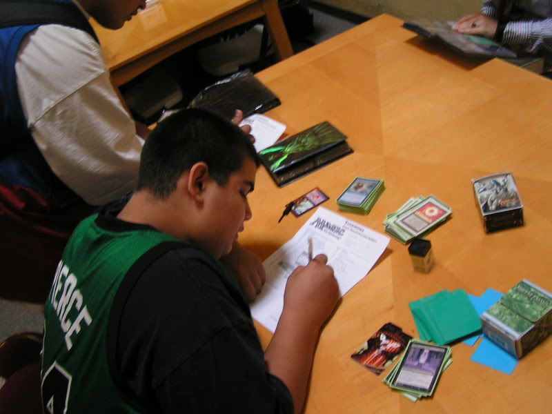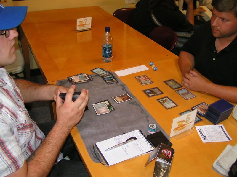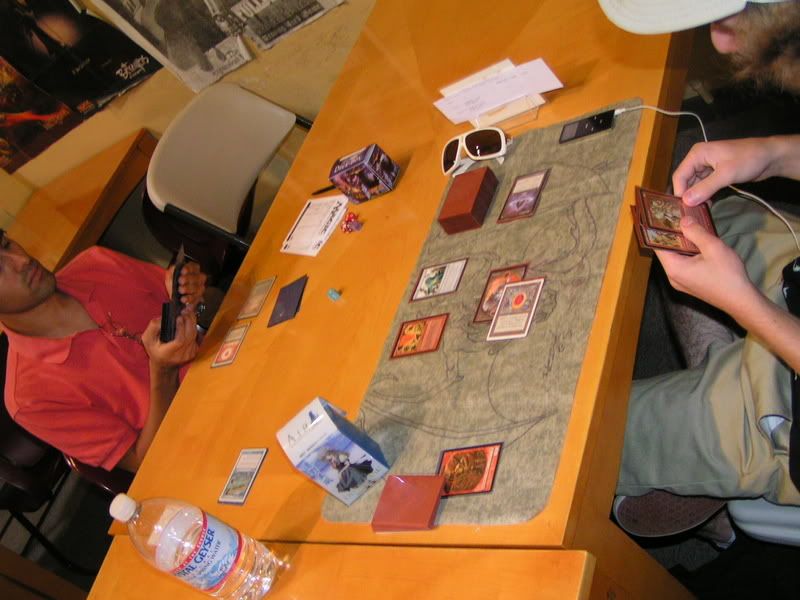 I ended up scooping to Michael. He was nice enough to do this favor for me, I know I can’t beat two Goblins. My chances are too slim, and beating Nate on round 2 was EXTREMELY lucky already. There is no way I am going to fight off two Goblins. I was really bummed actually, 3-2 can’t top 8 and… sigh. T__T or ~~~~~~>.<~~~~~~~ Why did I have to lose the last round, and why do I have to get paired against Goblins, TWICE.