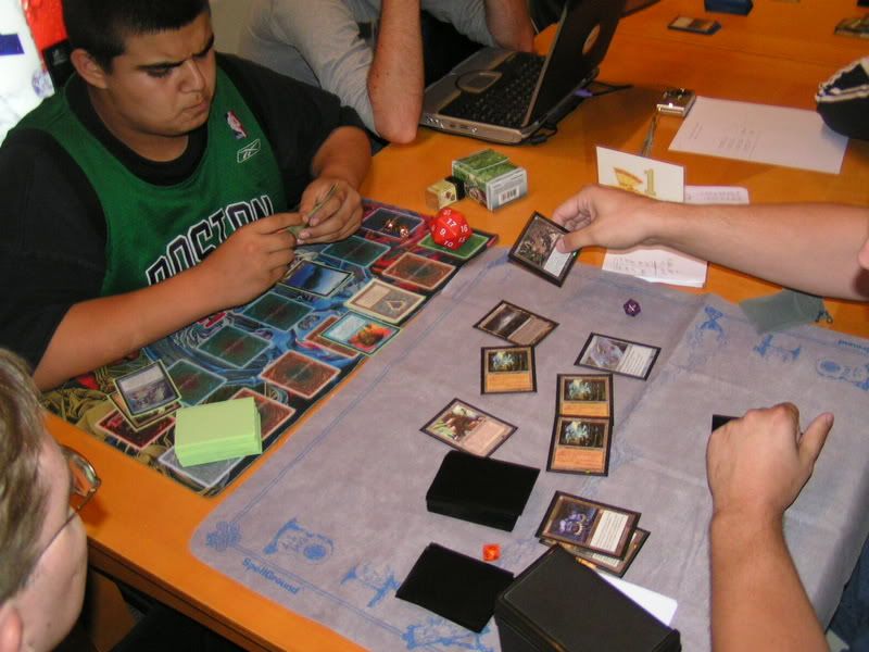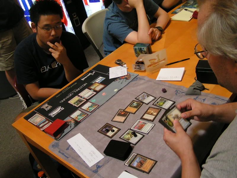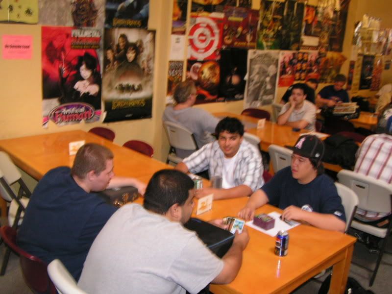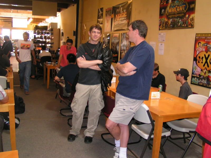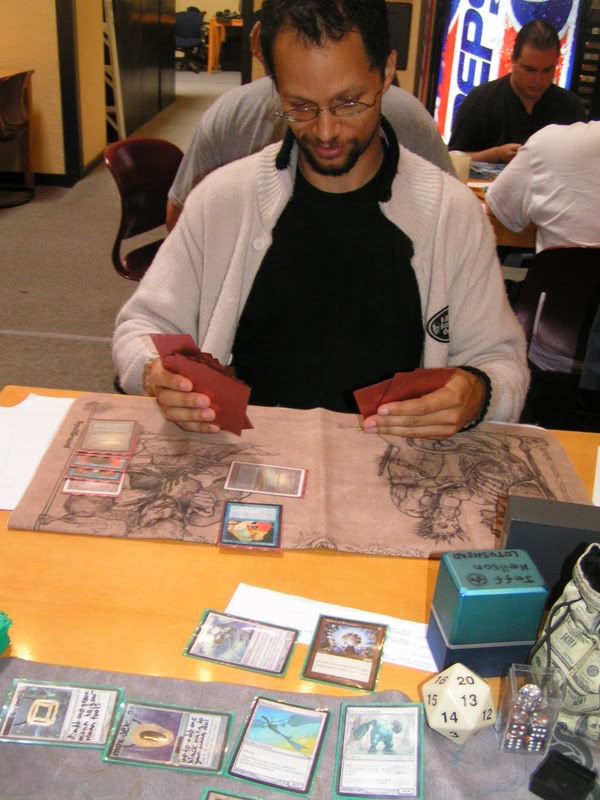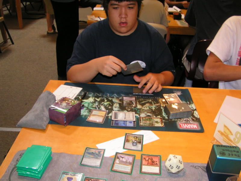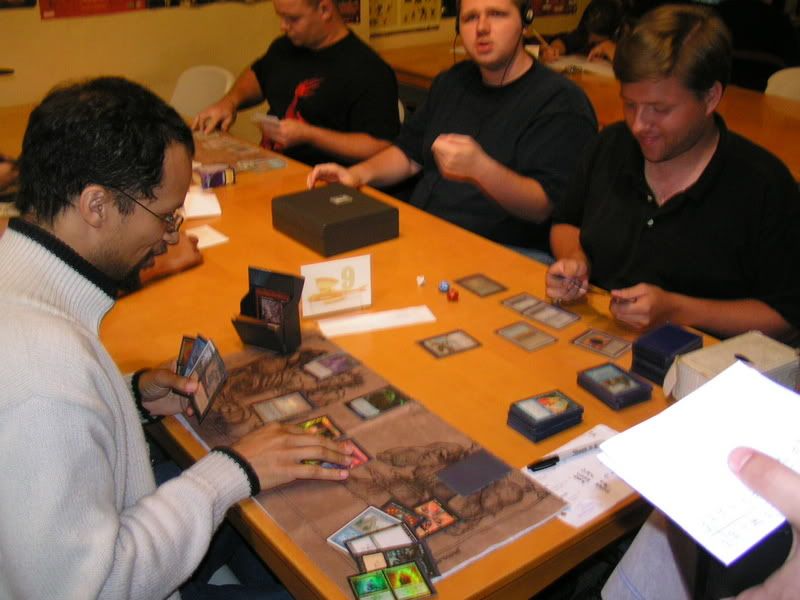 I scouted around and almost threw up, I want to beat myself up pretty bad. So I walked in with the assumptions of DI GAT and Flash, some workshop decks because I know for sure 2 players are playing it; Lotushead and Mike. But, good god, after round 1, I see like one goblin deck, workshops everywhere, some good number of GAT, and only a small handful of Flash. My maindeck Leylines were so bad. Okay, maybe workshop isn’t anywhere, but I am sure there were at least 5 workshop decks. Kevin, Nate’s friend, two I mentioned, the guy I lost to in 3rd round (do’h), and maybe more. Anyways, I feel, “god damn, Fish is SO not good of a choice right now. There is one goblin running around and like… >__<”