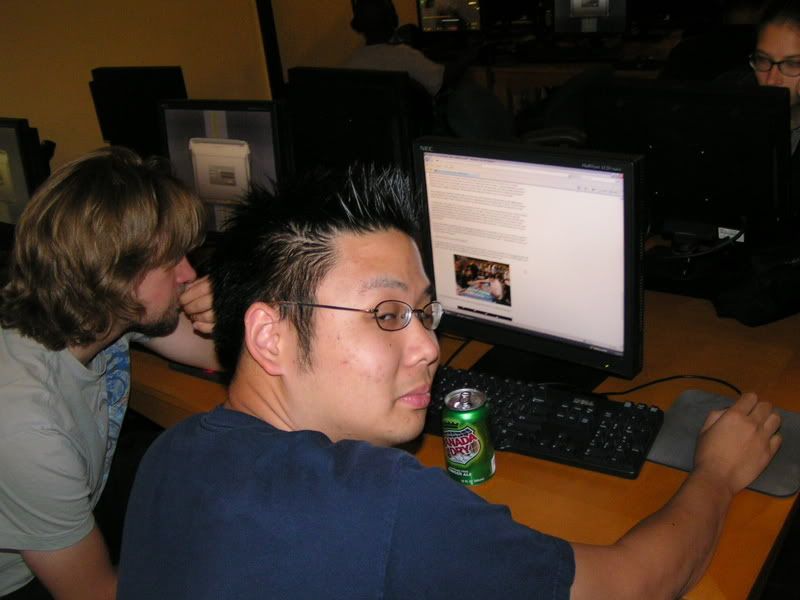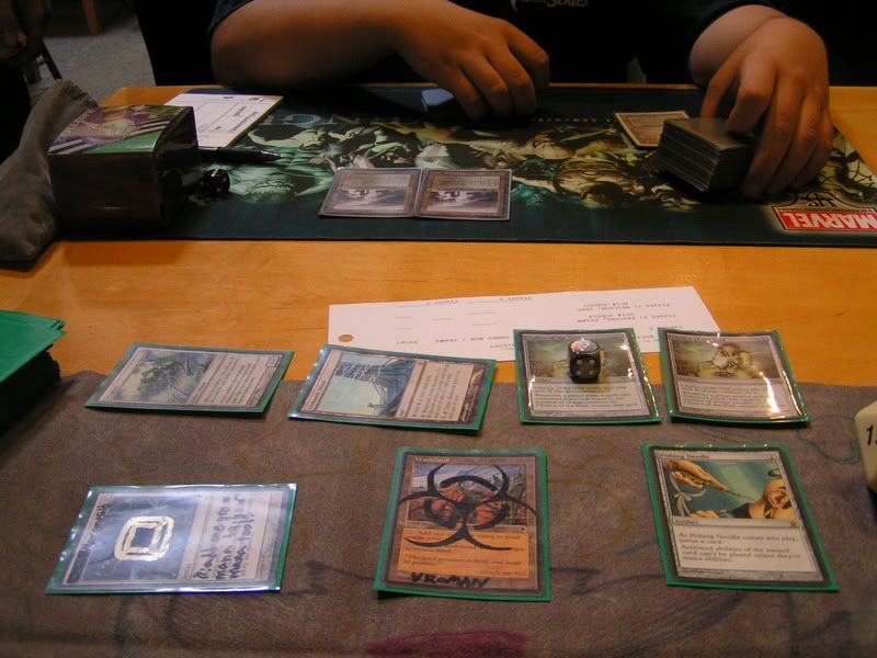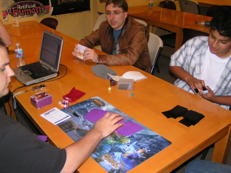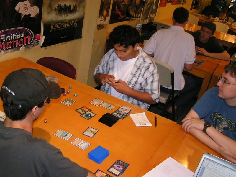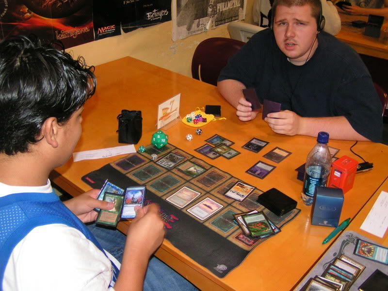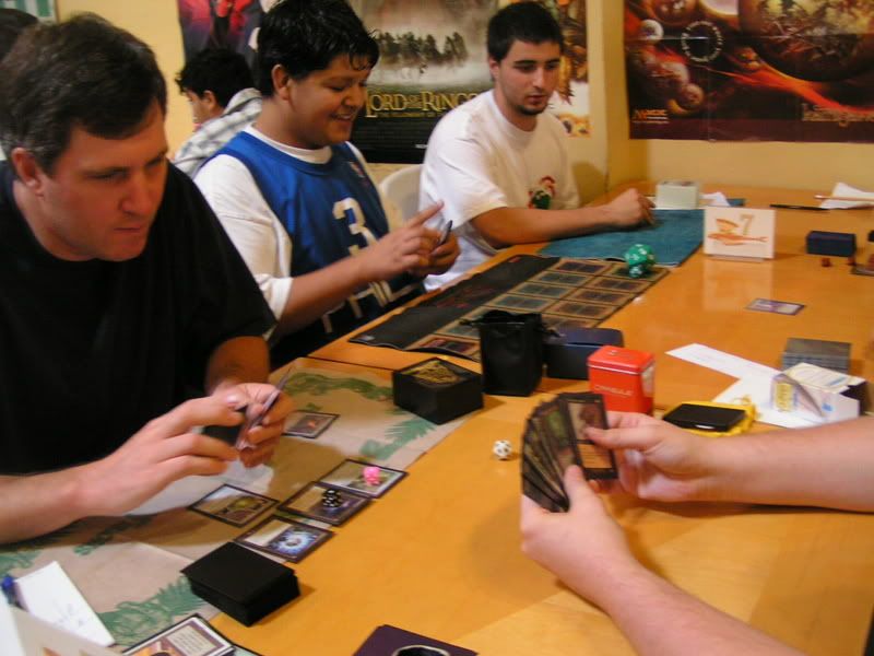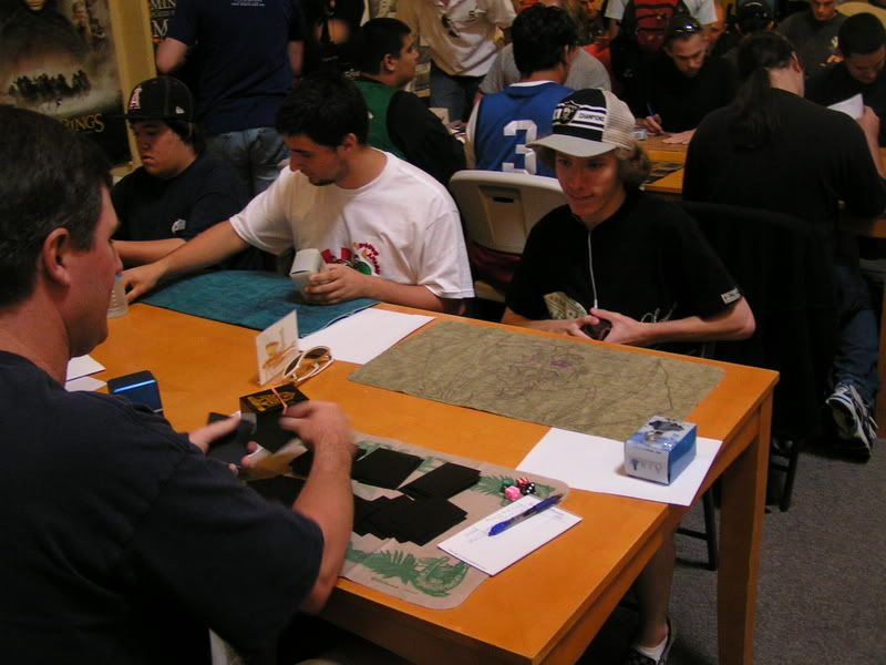 I scouted around and almost threw up, I want to beat myself up pretty bad. So I walked in with the assumptions of DI GAT and Flash, some workshop decks because I know for sure 2 players are playing it; Lotushead and Mike. But, good god, after round 1, I see like one goblin deck, workshops everywhere, some good number of GAT, and only a small handful of Flash. My maindeck Leylines were so bad. Okay, maybe workshop isn’t anywhere, but I am sure there were at least 5 workshop decks. Kevin, Nate’s friend, two I mentioned, the guy I lost to in 3rd round (do’h), and maybe more. Anyways, I feel, “god damn, Fish is SO not good of a choice right now. There is one goblin running around and like… >__<”