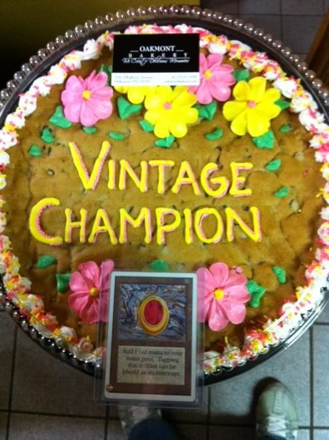 12 people showed up to battle in magics most broken format, Vintage. No TO report but i believe i went 6-0 including top 4 and won the whole thing with this: MUD Artifacts 4 Chalice of the Void 4 Tangle Wire 4 Sphere of Resistance 2 Thorn of Amethyst 2 Sculpting Steel 2 Crucible of Worlds 2 Smokestack 2 Ratchet Bomb 1 Black Lotus 1 Mox Sapphire 1 Mox Jet 1 Mox Ruby 1 Mox Emerald 1 Mox Pearl 1 Mana Crypt 1 Mana Vault 1 Sol Ring 1 Trinisphere Artifact Creatures 4 Lodestone Golem 2 Karn, Silver Golem 2 Triskelion 1 Wurmcoil Engine 1 Juggernaut Land 4 Mishra's Workshop 4 Ancient Tomb 4 Wasteland 2 City of Traitors 2 Mishra's Factory 1 Tolarian Academy 1 Strip Mine Sideboard 4 Leyline of Sanctity 4 Leyline of the Void 3 Pithing Needle 2 Duplicant 2 Jester's Cap The lone Juggernaut was supposed to be a Wurmcoil Engine but I couldn't find another before the tourney started. Any questions, comments or concerns please feel free to ask.  Thats the Mox Ruby I won and the "cookie cake" the organizer gave to the winner!