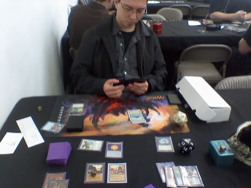 Game 2 he plays early key, and next turn Demonic Tutors. We chat a bit about something (school maybe) and then I realize he's resolving Demonic Tutor with a Voltaic Key out. D'oh! I scoop