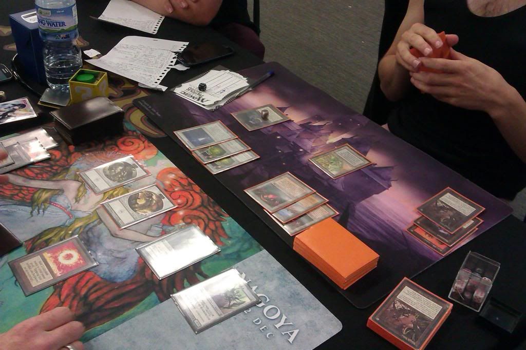 Game one was obviously my first match of the day. Al is a regular in the Melbourne Vintage scene and he is usually on either Grixis Control or Dredge. I kept a relatively good hand (though my g1 vs Dredge is quite bad) for either.  I won the die roll and proceeded to play a game of Lodestone aggro as two Lodestones and a Chalice over the first two turns were enough to put the game away. The only memorable thing about this game was my first warning for the event. I was sitting back thinking about my attacks on abut turn 4, when I glance at my scoresheet and see “Fetch” written down on my scoresheet. Unthinkingly, I reach over for my opponent’s deck and cut it. … Having already cut it on turn 1 when he fetched. The judge was called over and it was ruled that as it did not affect the game state (no known info etc) it was a warning. I felt really bad after that but I played on and handily took that game.