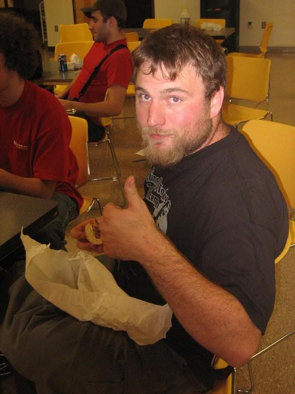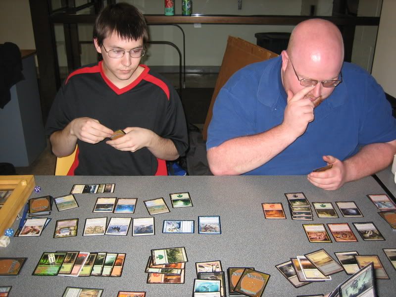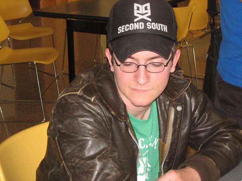*Pictures taken by Joe Davis*  Complete with regard to every detail, Kevin is analyzing the game state and eventually concluding that 2 is "low".   Dan Herd, or notoriously known as theGuyWhoFarted, is eating the sandwich that was responsible for three of us being 10 minutes late.  I don't know what this guy is playing. SlaverShopAggro?  A Blitzkriegian with Manaless Ichorid against MDG in Top 4.  Meddling Mage in Bomberman is hot tech.  5 Color Magic and a big belly.  2 Headed Giant. Unfortunately there are ZERO pictures of me OR the tournament organizer, Mike.