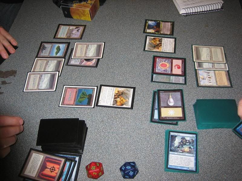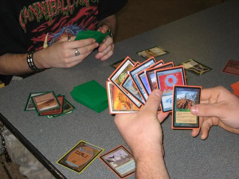 The picture with the mirror of Boomerman, i'm on the left side of the picture. You can see by looking at Volcanic Island in the picture, I was splashing red. I actrally added red mainly for the sb. I had 3 Red Elemental Blast and 2 Pyroblast and 3 Flametounges in the board. I also change the main deck alittle bit from the usually version. I cut the Mana Leaks and added Fact or Fiction, one Merchant Scroll, and aditional land. I also cut the Cunning Wishes because I limited my space in the sb by adding red and change them to Repeals. I also change out one of my three Aether Spellbombs to a Pyrite Spellbomb. I wish I didn't run that extra land, I got mana floaded to many games. There were way to many times, I got unlucky not hitting any artifacts with my Thrist for Knowledge. If I could change it again, I cut the extra land and add another artifact, uppering the count to 14 maindeck artifacts. Early game I played my Moxes, I wanted them on the board and then Thirsting into no artifacts sux. With the decline of Fish and Stax, I think added red was the right choice. I lost to Gifts and Drain Intution Combo. I won agaisnt Slaver, Mirror, and 7/10. So I fininish 3/2 just missing the top 8.  I really like running the one random Merchant Scroll, it searches for so many cards, Repeal, Recall, Fact or Fiction, Counter, Thrist, and brainstorm. I think Fact or Fiction should be maindeck in the deck, for one more mana its so much better than thirst. But again I got very unlucky with drawing into artifacts with thirst.