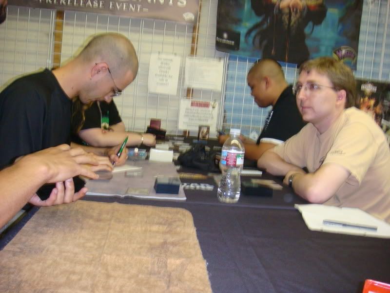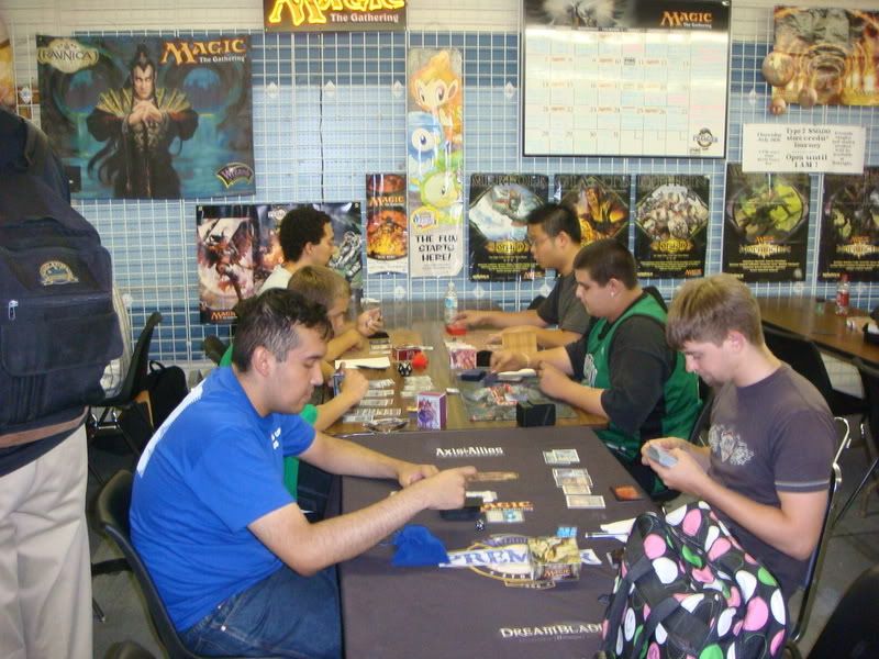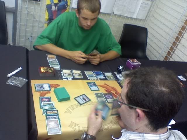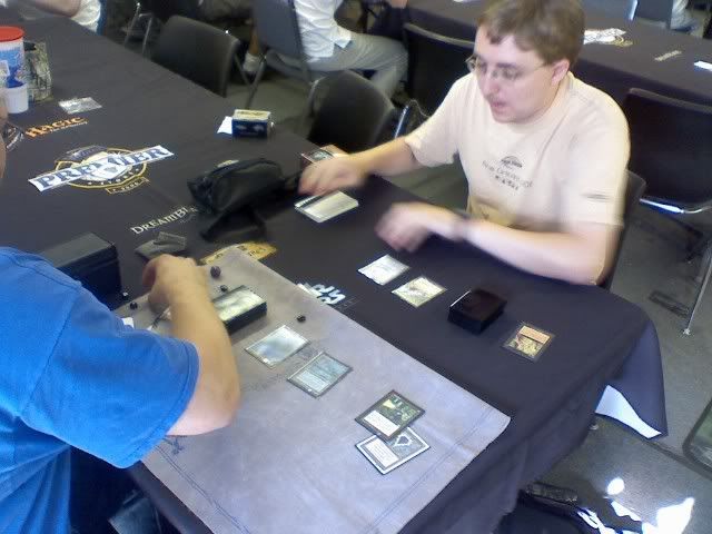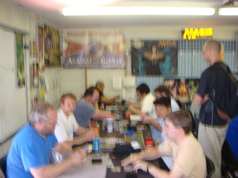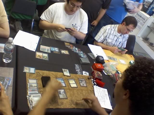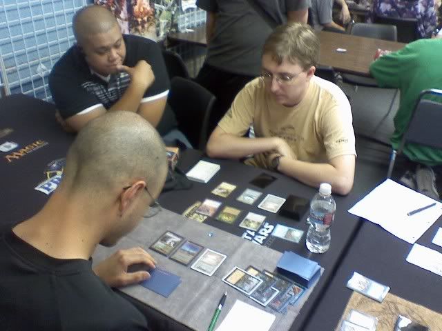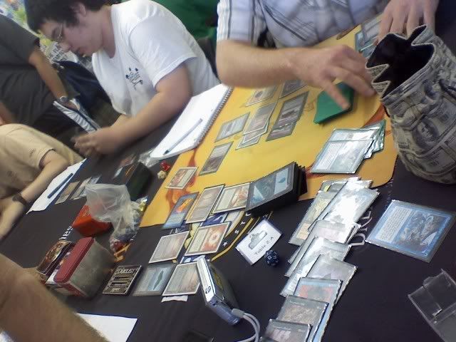 Time for pics finally  If I recall, Dr. Tongue throws fat bomb after fat bomb at Aardshark's Forces and Drains. Yawgwill in grave, sad site.  Webster ponders "post brainstorm/ponder/gush/scroll restrictions aside, having an Oath on the field is still bad."  Chistiaan sees just how awesome Mindsensor's are vs UR Landstill.  Goblin Welder let me chump DSC with Karn turn after turn, but Luis still got there. (damn time walk)  Null Rods. at least 4 decks played them. I though we movied past this hater card? (shopdeck player weeps)  Team Vacaville's Alex finally put the crack pipe down and slung magical cards again.. Galen threw his hand into a Rebuild combo fit that ended with TRICKBIND from Alex. Alex plays land, go (or something equally weak), and had Trickbind #2 ready to go. Aardshark topdecks YawgWill, casts at LEAST 3 Thirst For Knowledges, in addition to other spells, and the VERY last card he hit was the 1 Thoughtseize he left in the deck. Lucksack, I mean Good play Galen. more edited into this post later...