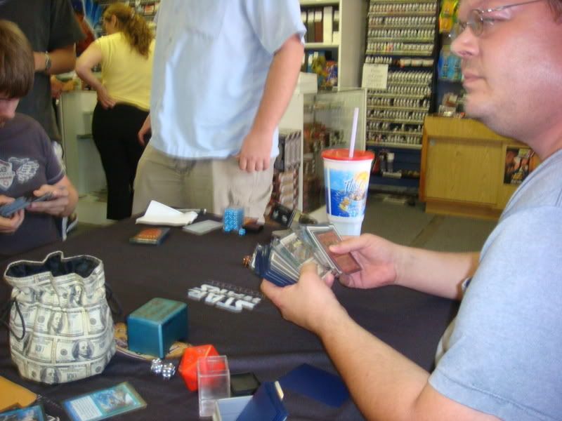 Ochoa was playing Pitchlong perhaps? I thought I remembered him Forcing some stuff of mine (like my Negator , sigh). Grim Long has more black and no Forces I think, but I'm no expert as we all can tell.  Reserving this spot for a few pics I had as well, bummer about your camera Jeff. I scrubbed pretty badly. Went to time w/ Galen rd. 1 1-1 apiece with me removing 2/3 of his win conditions game 3 (he had DSC in hand). I drew crap off Twisters twice in the tourney. Both times I drew 6 mana sources (lands,moxen,rits) of off my Timetwisters, and to add insult to injury I drew my DSC for card 7 each time. I drew my lone DSC more times than I did my FoW's...sheesh. Me and Jeff finally got to play a game IRL, I've played him 25 times at least but it's usually online. Same with Galen (Aardshark). Good job on the strong finish btw.  Peace out. Sorry there wasn't more pictures, maybe next time.  D. Ochoa (heavily favored) and R. Reynolds (Eudo T1 judge) playing round 1.  Lotushead pretending to SB vs. Eirik round 1.  Blurry ass picture of top tables (round 2). Corey Redmond playing vs. Ryan Reynolds in foreground.  Table 6-9 round 2. The only absent spot is where I soundly beat my opponent (Erika-her first tourney) in 2 quick games. Sorry, my deck just went off on you quickly without much disruption facing it.