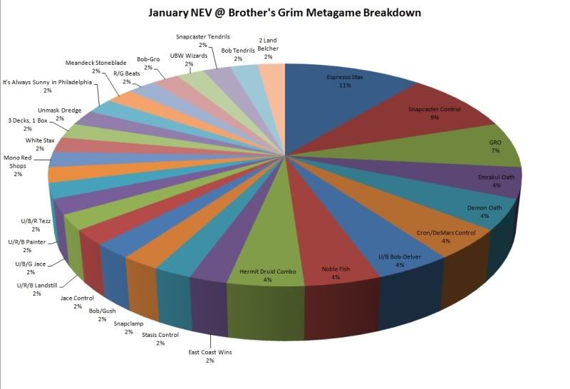 And 2012 has begun! At the second NEV event nobody could stop Ryan Glackin, running Matt Elias’s Gro list. Congrats, Glackin! The Complete Metagame Breakdown: Drains:Snapcaster Control: 4 Meandeck Stoneblade: 1 East Coast Wins: 1 Stasis Control: 1 Emrakul Oath: 2 Demon Oath: 2 Snapclamp: 1 Bob/Gush: 1 Jace Control: 1 U/R/B Landstill: 1 U/B/G Jace: 1 Cron/DeMars Control: 2 U/R/B Painter: 1 U/B/R Tezz: 1 Shops:Espresso Stax: 5 Mono Red Shops: 1 White Stax: 1 Bazaars:3 Decks, 1 Box: 1 Unmask Dredge: 1 It’s Always Sunny in Philadelphia: 1 Null Rods:U/B Bob-Delver: 2 R/G Beats: 1 GRO: 3 Bob-Gro: 1 UBW Wizards: 1 Noble Fish: 2 Rituals: Snapcaster Tendrils: 1 Bob Tendrils: 1 2 Land Belcher: 1 Hermit Druid Combo: 2 There are many things to take away from this breakdown. Creature based strategies aren’t just viable, they’re a format defining aspect of Vintage right now. Snapcaster Mage has left an indelible mark on the format as he sees play in everything from Ritual based Combo, to Control, to Aggro. And then there’s Espresso, which, two years after development, continues to leave blue pilots on the side of the road as it continues to show its strength and resilience in the format. Top Eight Pairings and Results:Justin Leshen vs. Will Magrann – Leshen wins Michael Mahr vs. Michael Savage – Mahr wins Dan Mason vs. Bryan Brady – Mason wins Ryan Glackin vs. Corey Mann – Glackin wins Top Four Pairings and Results:Dan Mason vs. Michael Mahr – Mason wins Ryan Glackin vs. Justin Leshen – Glackin wins Finals:Ryan Glackin vs. Dan Mason – Glackin wins Congratulations to Ryan Glackin, Dan Mason and all the top eight competitors! While Gro may have won the tournament, I have to admit that I’m stunned that Espresso Stax took a full half of the top eight… Welcome to Shop Country! 1st – Ryan Glackin Elias Gro1 Ancestral Recall 1 Brainstorm 1 Flusterstorm 4 Force of Will 4 Gush 1 Hurkyl’s Recall 2 Jace, the Mind Sculptor 3 Mental Misstep 1 Merchant Scroll 4 Mystic Remora 1 Mystical Tutor 1 Ponder 1 Preordain 1 Time Walk 1 Tinker 1 Demonic Tutor 1 Vampiric Tutor 1 Yawgmoth’s Will 1 Fastbond 3 Tarmogoyf 2 Trygon Predator 1 Black Lotus 1 Blightsteel Colossus 1 Mox Emerald 1 Mox Jet 1 Mox Pearl 1 Mox Ruby 1 Mox Sapphire 1 Sol Ring 1 Time Vault 1 Voltaic Key 2 Island 4 Misty Rainforest 3 Scalding Tarn 3 Tropical Island 3 Underground Sea SB:1 Flusterstorm 1 Sower of Temptation 1 Dismember 4 Leyline of the Void 2 Yixlid Jailer 4 Nature’s Claim 1 Nihil Spellbomb 1 Forest 2nd – Dan Mason Espresso Stax4 Chalice of the Void 4 Tangle Wire 4 Smokestack 4 Sphere of Resistance 4 Phyrexian Metamorph 4 Lodestone Golem 2 Phyrexian Revoker 1 Trinisphere 2 Crucible of Worlds 3 Karn, Silver Golem 1 Black Lotus 1 Sol Ring 1 Mana Crypt 1 Mox Sapphire 1 Mox Jet 1 Mox Ruby 1 Mox Emerald 1 Mox Pearl 4 Mishra’s Workshop 4 Wasteland 4 Ancient Tomb 1 Strip Mine 1 Tolarian Academy 3 Mishra’s Factory 3 Rishadan Port SB:3 Dismember 4 Tormod’s Crypt 3 Relic of Progentius 3 Duplicant 1 Crucible of Worlds 1 Ghost Quarter 3rd – Justin Leshen Dredge is the Only Real Deck4 Stinkweed Imp 4 Bazaar of Baghdad 1 Mental Misstep 4 Bloodghast 2 Flame-Kin Zealot 1 Mox Sapphire 1 Black Lotus 3 Undiscovered Paradise 4 City of Brass 1 Lion’s Eye Diamond 2 Sun Titan 1 Dakmor Salvage 4 Narcomoeba 1 Ancestral Recall 4 Bridge from Below 4 Golgari Grave-Troll 1 Brainstorm 1 Chain of Vapor 1 Lotus Petal 1 Nature’s Claim 3 Fatestitcher 4 Cabal Therapy 3 Ichorid 3 Dread Return 2 Golgari Thug SB:4 Leyline of the Void 2 Nature’s Claim 2 Mental Misstep 3 Chain of Vapor 2 Firestorm 1 Darkblast 1 Serenity 4th – Michael Mahr Espresso Stax3 Karn, Silver Golem 4 Lodestone Golem 3 Phyrexian Metamorph 3 Winter Orb 3 Crucible of Worlds 3 Smokestack 4 Tangle Wire 4 Chalice of the Void 3 Thorn of Amethyst 1 Trinisphere 4 Sphere of Resistance 1 Sol Ring 1 Mana Vault 1 Mana Crypt 1 Mox Sapphire 1 Mox Jet 1 Mox Ruby 1 Mox Emerald 1 Mox Pearl 1 Tolarian Academy 1 Strip Mine 4 Ancient Tomb 3 Rishadan Port 4 Wasteland 4 Mishra’s Workshop SB:3 Duplicant 3 Relic of Progenitus 3 Ghost Quarter 2 Tormod’s Crypt 1 Crucible of Worlds 3 Pithing Needle 5th – Will Magrann Espresso Stax1 Black Lotus 4 Chalice of the Void 1 Mana Crypt 1 Sol Ring 4 Sphere of Resistance 2 Thorn of Amethyst 2 Crucible of Worlds 4 Tangle Wire 1 Trinisphere 4 Lodestone Golem 4 Phyrexian Metamorph 4 Smokestack 3 Karn, Silver Golem 1 Strip Mine 1 Tolarian Academy 3 Mishra’s Factory 3 Rishadan Port 4 Ancient Tomb 4 Mishra’s Workshop 4 Wasteland SB:3 Dismember 4 Tormod’s Crypt 3 Relic of Progenitus 2 Duplicant 3 The Tabernacle at Pendrell Vale 6th – Corey Mann Espresso Stax1 Black Lotus 4 Chalice of the Void 1 Mana Crypt 1 Sol Ring 4 Sphere of Resistance 2 Thorn of Amethyst 2 Crucible of Worlds 4 Tangle Wire 1 Trinisphere 4 Lodestone Golem 4 Phyrexian Metamorph 4 Smokestack 3 Karn, Silver Golem 1 Strip Mine 1 Tolarian Academy 3 Mishra’s Factory 3 Rishadan Port 4 Ancient Tomb 4 Mishra’s Workshop 4 Wasteland SB:3 Dismember 4 Tormod’s Crypt 3 Relic of Progenitus 2 Duplicant 3 The Tabernacle at Pendrell Vale 7th – Michael Savage Blouse1 Mox Sapphire 1 Mox Jet 1 Mox Ruby 1 Mox Emerald 1 Mox Pearl 1 Black Lotus 1 Mana Crypt 1 Sol Ring 1 Voltaic Key 1 Time Vault 2 Sensei’s Divining Top 1 Blightsteel Colossus 4 Force of Will 3 Mana Drain 3 Mental Misstep 2 Flusterstorm 4 Dark Confidant 2 Jace, the Mind Sculptor 1 Tezzeret the Seeker 1 Demonic Tutor 1 Vampiric Tutor 1 Mystical Tutor 1 Ancestral Recall 1 Time Walk 1 Fire/Ice 1 Hurkyl’s Recall 1 Misdirection 1 Yawgmoth’s Will 1 Brainstorm 1 Thirst for Knowledge 1 Merchant Scroll 3 Underground Sea 2 Volcanic Island 1 Tolarian Academy 1 Tinker 2 Island 4 Scalding Tarn 2 Misty Rainforest 1 Mountain SB:4 Leyline of the Void 3 Yixlid Jailer 2 Red Elemental Blast 2 Lightning Bolt 3 Ingot Chewer 1 Hurkyl’s Recall 8th – Bryan Brady Terminator 2: Judgment Day1 Merchant Scroll 1 Mystical Tutor 4 Hermit Druid 