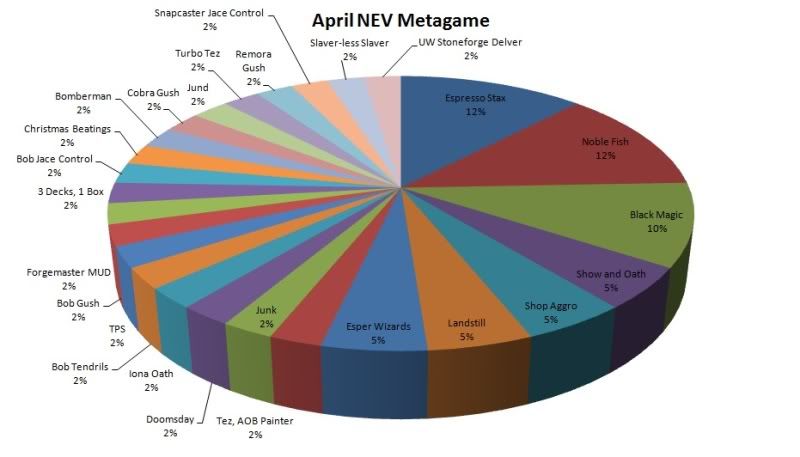 I had a pretty good day (4-2, 10th) despite losing round 1 to not showing up on time. It was nice for no one to play Dredge. All the maindeck Cages in that big slice of the meta-pie that is Noble Fish must have scared the Dredge monster away. Dont get comfortable, though, Dredge is the best when people think its bad.