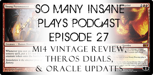 http://www.eternalcentral.com/?p=4119Kevin Cron and Steve Menendian review M14 for Vintage. Also, we discuss Theros Duals, Oracle updates, and our Dragon’s Maze report card.  Podcast (somanyinsaneplays): Download (Duration: 1:24:30 — 80.7MB) Timestamped Table of Contents: 0:02:42: Theros Dual Lands 0:11:40: Oracle Updates 0:26:18: Dragon’s Maze Report Card 0:36:20: Chandra, Pyromaster 0:43:35: Glimpse the Future 0:45:52: Young Pyromancer 1:01:28: Strionic Resonator (Cromulent Resonator) 1:07:55: Imposing Sovereign 1:10:57: Mindsparker 1:14:25: Banisher Priest 1:16:08: Dark Prophecy 1:18:44: Haunted Plate Mail Total runtime: 1:24:30 Show Notes - M14 Set - M14 Oracle Updates - Team Serious Vintage Open in Columbus, OH – July 27 - Eudomania Summer Vintage Tournament in Berkeley, OH – July 28 - Odyssey Games Vintage Tournament in Kalamazoo, MI – August 3 Contact us at @ManyInsanePlays on Twitter or e-mail us at SoManyInsanePlaysPodcast@gmail.com. Podcast (somanyinsaneplays): Download (Duration: 1:24:30 — 80.7MB)
