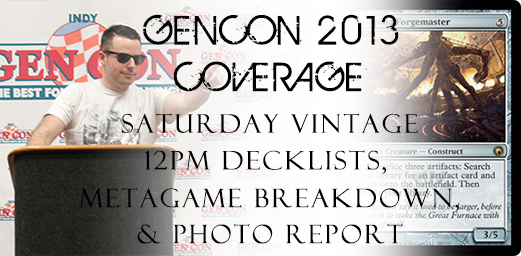 We are proud to bring you the Top 8 decklists from the GenCon 2013 Vintage Saturday 12pm tournament (for uncut sheet of Urza's Saga and other prizes). Below you will also find a complete metagame breakdown, with a list of what deck type each player played, a metagame breakdown, and pictures from the event itself. Enjoy! http://www.eternalcentral.com/?p=4225Check it out and let us know if we missed anything. PS. We're working to see if we can reconstruct the Top 8 decklists from the Friday event (lost by the tournament organizer apparently). If you have any info of names, decklists, and anything else please feel free to post here or PM me. Thanks!