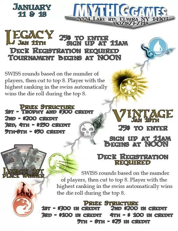 Author Topic: *Jan 18th, Elmira, NY, Mythic Games Vintage tournament* GUARANTEED prizes!  (Read 4097 times)